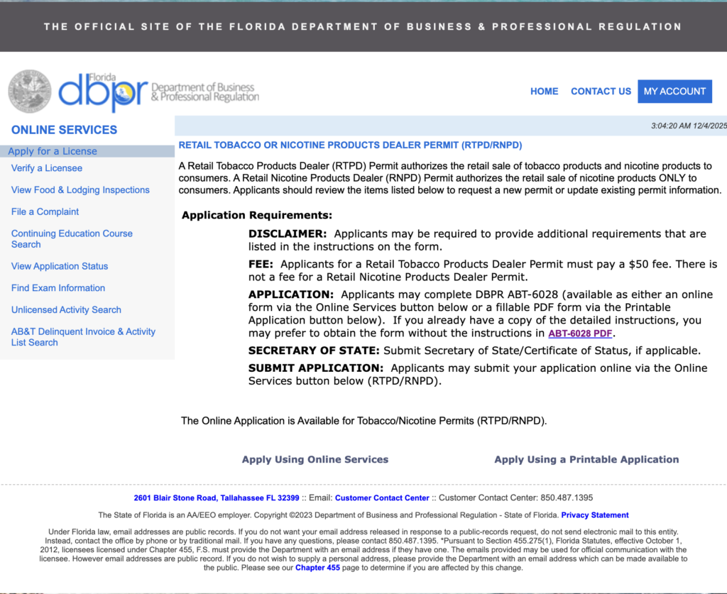 Download and complete Form DBPR ABT-6028 (Application for Retail Tobacco Products Dealer Permit or Retail Nicotine Products Dealer Permit) from the Florida Department of Business and Professional Regulation.